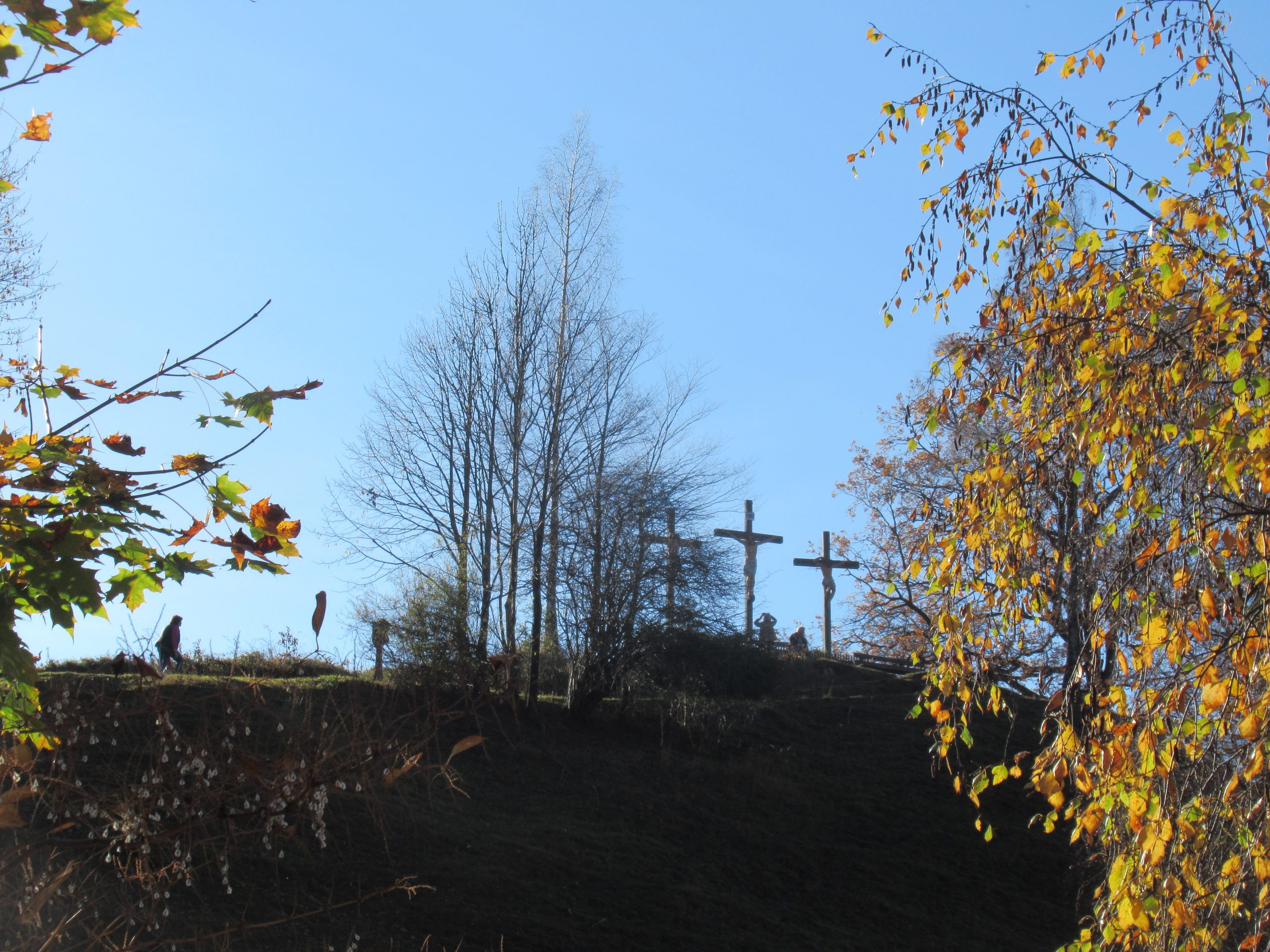 Kreuzigungsgruppe am Kalvarienberg von der Wallfahrtskapelle Birkenstein aus