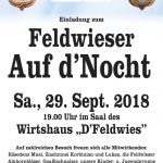 Am Samstag, 29. September veranstaltet der Feldwieser Trachtenverein seinen Feldwieser Auf D´Nocht und blickt zu diesem Saisonabschluss auf die vergangenen 12 Monate und die zahlreichen Aktivitäten zurück. Unsere Goaslschnalzer, Auftritte der Kinder- und Jugendgruppe sowie der Aktiven und die musikalische Umrahmung durch die Räsedenz Musi, Korbinian Hiendl mit der Ziach sowie die Alphornbläser werden uns einen kurzweiligen Abend im Kreise der Feldwieser Trachtler schenken.