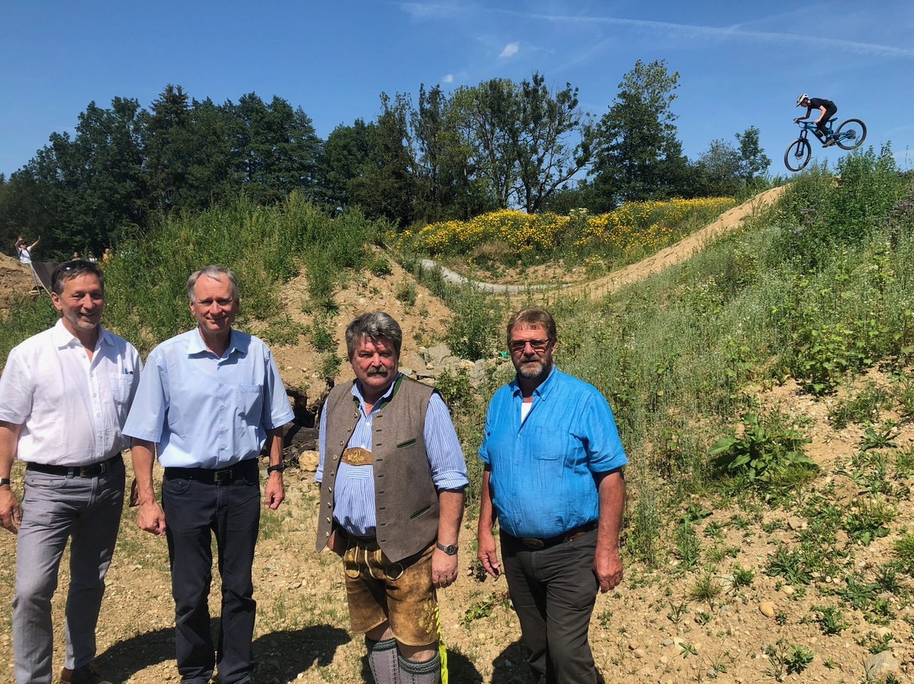 Viele schöne Stunden im Bikepark wünschten Amerangs Bürgermeister Konrad Linner (von links), Dr. Georg Kasberger (AELF), Josef Reithmeier (Vorsitzender der Leader-AG Chiemgauer Seenplatte) und zweiter Bürgermeister Werner Fröwis
