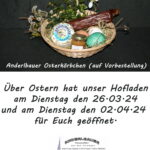 Für die Zeit über Ostern bietet der auf Vorbestellung Osterkörbchen aus seinem Direktvermarktungssortiment an. Der Hofladen hat vor Ostern am Dienstag, 26. März und nach Ostern am Dienstag, 2. April geöffnet.
