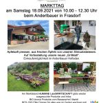 Am kommenden Samstag, den 18. September 2021, findet beim Anderlbauer in Frasdorf wieder von 10 bis 12.30 Uhr der Markttag statt. Dieses Mal gibt es als Besonderheit die Möglichkeit, Apfelsaft aus den Äpfeln der Streuobstwiesen zu pressen.
