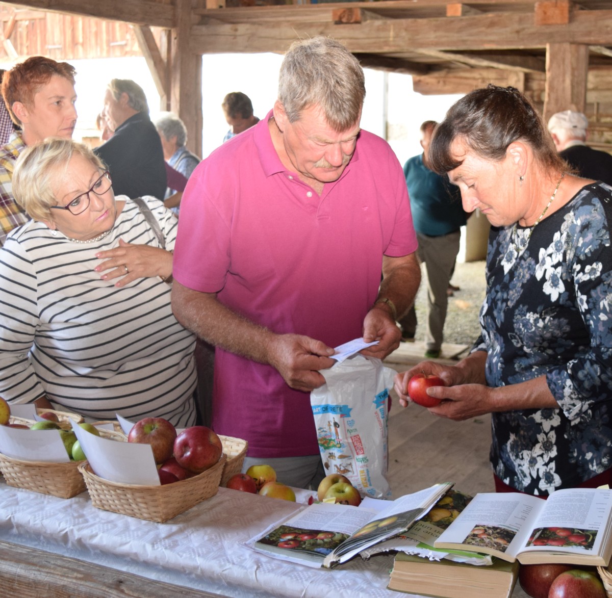 Die Pomologin Maria Seidinger bestimmt fachkundig mitgebrachte Äpfel und Birnen der Besucher. © Bezirk Oberbayern, Archiv BHM, Gerhard Nixdorf