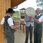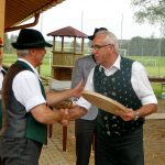 Seitdem vor gut zehn Jahren in Holzhausen in der niederbayerischen Gemeinde Geisenhausen der Bayerische Trachtenverband mit der Errichtung des Trachtenkulturzentrums begonnen hat, hat sich  Walter Sirtl aus Geisenhausen in ungezählten Stunden bei den Bauarbeiten eingebracht. Als „rechte Hand“ von stellvertretendem Landesvorsitzenden Peter Eicher war er bei den Bau- und Handwerkerarbeiten dabei, als der ehemalige Pfarrhof umgebaut sowie die Bauten für die Jugend mit Zeltlagerplatz und Bildungsstätte entstanden. Auch bei den Arbeiten für das Archivgebäude, für den Augustiner-Stadl sowie zuletzt für die Kegelbahn war Walter Sirtl zur Stelle. Für all diese Verdienste zugunsten des Bauwerkes und für die Jugend überreichte Günter Frey für die Bayerische Trachtenjugend im Beisein von Landesvorsitzenden Max Bertl (li.) an den stets fleißigen und verlässlichen Arbeiter Walter Sirtl (re.) zum Dank eine gemalte Scheibe.