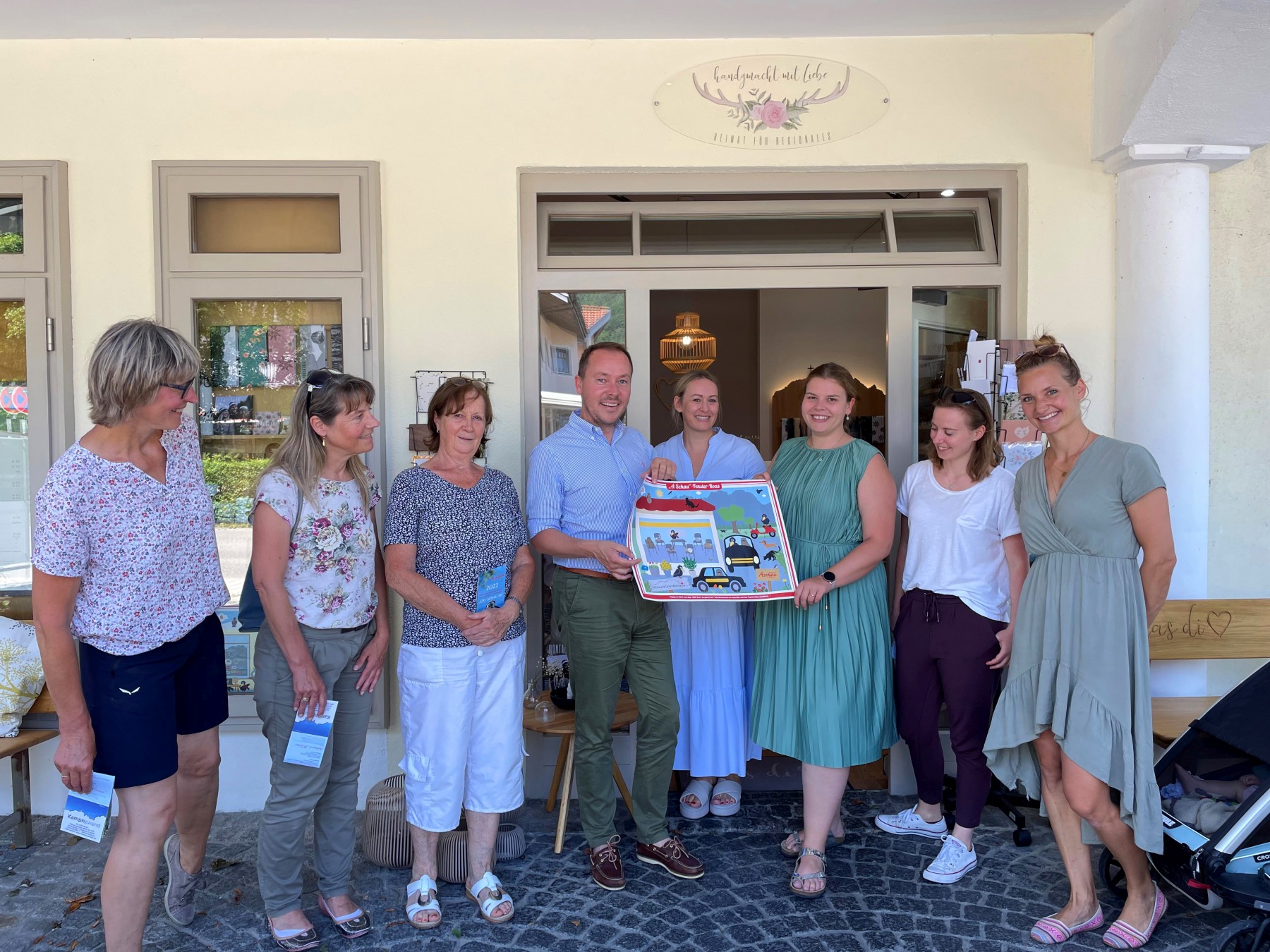 Der Leiter der Tourist Infos Herbert Reiter (Mitte) und Mitarbeiterin Verena Weinhammer (Dritte von rechts) freuten sich die Vermieterinnen die „A Schau“-Fenster Roas an verschiedenen teilnehmenden Betrieben vorstellen zu dürfen. Auch die Ladeninhaberin Tanja Hailer (Vierte von rechts) von „Handg‘macht mit Liebe“ war vor Ort mit dabei.