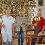 Als letzter Schritt der Renovierungsarbeiten an der Aschauer Kreuzkapelle wurde das neue Kreuz auf das Dach gesetzt. Malermeister Walter Bilek brachte das neue Kreuz, Kirchenpfleger Werner Weyerer die kupferne Zeitkapsel und Spenglermeister Herbert Wimmer die neu vergoldete Kugel (von links)