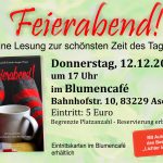 Nur einen Tag später, am Donnerstag, 12. Dezember, kann man den Feierabend literarisch begehen, indem man die Lesung aus der Kurzgeschichtensammlung „Feierabend – 36 Geschichten für die schönsten Stunden des Tages“ besucht. Beginn ist um 17 Uhr im Blumencafé, bei der es neben einer gemütlichen Atmosphäre auch feine Snacks und Kuchen gibt. Das besondere Highlight ist der Auftritt einer Nachwuchsautorin aus dem Chiemgau.