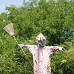 In luftiger Höher einen treuen Dienst leisten und dabei dem Federvieh regelrecht etwas vorgaukeln, ja das ist eine Vogelscheuche. Mit viel Liebe wurde diese menschenähnliche Figur aus Holzstangen, alten, abgetragenen und zerfetzten Kleidungsstücken und einem Lederfußball zusammengebastelt. Durch ihre Silhouette und Bewegungen im Wind werden derzeit die Früchte von Kirschen oder wie hier die Hollerbeeren beschützt. Hinzukommt, dass wie diese kreative Gestalt in einem Privatgarten in Aschau i.Chiemgau, es noch dazu ein Blickfang für den menschlichen Betrachter ist.