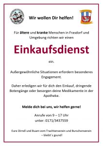 Auch der Frasdorfer Trachtenverein und der örtliche Burschenverein haben einen Einkaufsdienst für alte und kranke Menschen ins Leben gerufen. Näheres siehe in der Anlage sowie unter der Telefon-Nummer 0171-3437559 (von 9 bis 17 Uhr).