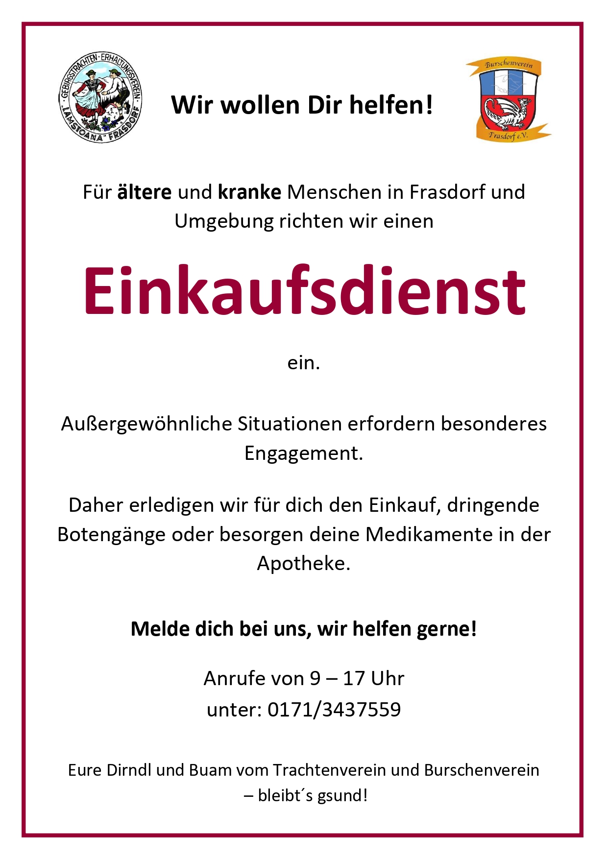 Auch der Frasdorfer Trachtenverein und der örtliche Burschenverein haben einen Einkaufsdienst für alte und kranke Menschen ins Leben gerufen. Näheres siehe in der Anlage sowie unter der Telefon-Nummer 0171-3437559 (von 9 bis 17 Uhr).