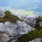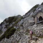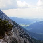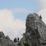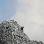 Nach der Einkehr machen wir uns wieder auf den Weg. Es geht aussichtsreich nur mit leichtem Auf und Ab auf dem Mittelstaufensteig weiter, teils drahtseilgesichert. Eine Gams zeigt sich in den Felsen, dann noch zwei Gemsen in schwindelnder Höhe. Insgesamt drei Gemsen führen ihre Kletterkünste vor. Wir bleiben stehen, um den seltenen Anblick zu genießen und Fotos zu machen. Noch lange haben wir dieses schon ganz besondere Erlebnis im Kopf.