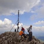 Der Einstieg ist nur schwer zu finden, man muss ihn wissen und das soll auch so bleiben. Gleich von Beginn an zieht der Steig steil und fast in gerader Linie hinauf zur Goldtropfwand und bietet immer wieder wunderschöne Aus- und Tiefblicke.  Es geht durch dichte Latschenfelder  in denen man sich schnell verirren kann, wenn man nicht aufpasst. Wir kommen aus der Baumgrenze heraus und es beginnt steiles Schrofengelände. Bald stehen wir  vor einer Felswand und sehen in einer Felsnische das “Wandbuch”, das hier nicht am Gipfel, sondern schon am Fuss der Felswand zu finden ist. Wir tragen uns ein, blättern zurück und stellen fest, daß wir uns schon im Oktober 2000 einmal eingetragen haben.