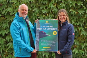 Nationalpark-Umweltbildungsreferent Lukas Laux und Hanna Oßing, die gerade noch ihr Commerzbank-Umweltpraktikum im Bayerischen Wald ableistet, mit dem Plakat für die gerade angelaufene Bewerbungsphase für die begehrten Praktikumsplätze im Jahr 2024. (Foto: Nationalpark Bayerischer Wald)