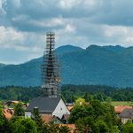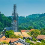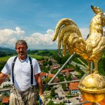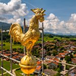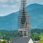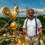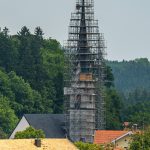 Das Baugerüst am Turm der Frasdorfer Kirche St. Margaretha wurde bis zur Höhe der Kirchturmspitze fertiggestellt. Nun können auch an der Turmspitze umfangreiche Restautierungsarbeiten beginnen. Stolz präsentiert der Gerüstbauer Maik Gollnow (Mitarbeiter der Firma StahlRohrGerüstbau GmbH) das fertige Gerüst Aug’ in Aug’ mit dem Wetterhahn auf der Kirchturmspitze in einer Höhe von 56m.