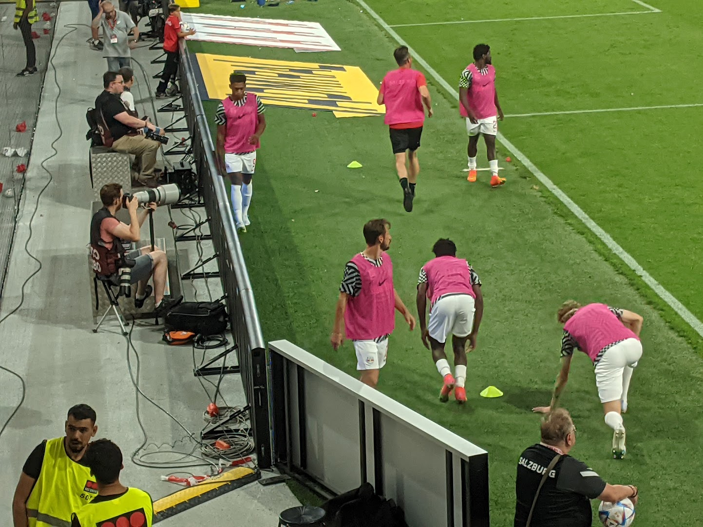 Ulmer, Koita, Diabou, Kjaergard und Adamu beim Aufwärmen