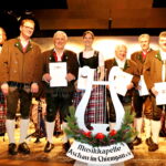 Michaela Haindl, Bezirksjugendleiterin Inn-Chiemgau des Musikbundes Ober- und Niederbayern und der Vorsitzende der Aschauer Musikkapelle Simon Pertl zeichneten (von link) Helmut Gawlik (60 Jahre) – Anna Mayer (Goldenes Leistungsabzeichen) – Georg Antretter (60) – Peter Anner (40) – Andreas Steinberger (40) mit der Urkunde und dem Ehrenzeichen des Musikbundes aus.