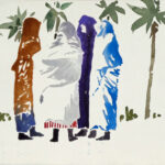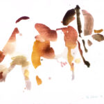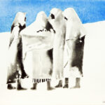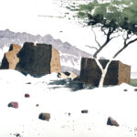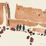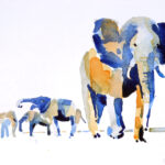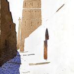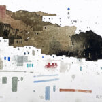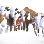Wir beschäftigen uns dann mit den ausgestellten Bildern. Die Atmosphäre eines ehemaligen Kuhstalls mit einem Ambiente, das eine gewisse Verbindung zum Pleinair hat, hat ihn besonders gereizt. Viele der Aquarelle sind vor Ort entstanden, andere im Atelier. Seine reduzierte Malweise lässt dem Betrachter die Möglichkeit, eigenes Empfinden in die Interpretation miteinzubeziehen. Typisch dafür sind Bilder auf denen Farbflecken neben großen weißen Flächen ein Motiv nur andeuten ohne es auszuformulieren, wie z.B. bei den Bildern “Zagora, Tissergate”, “Rajasthan, Jaipur, Inder” oder den in Flecken aufgelösten “Kühen”.