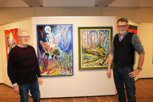 Der Borkenkäfer und der neu nachwachsende, wilde Wald: Josef Schneck (l.) und Christian Binder, Leiter vom Waldgeschichtlichen Museum, zeigen zwei Malereien, die in der Ausstellung zu sehen sind. (Foto: Nationalpark Bayerischer Wald)