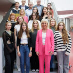 Das Foto zeigt: Bayerns Sozialministerin Ulrike Scharf zusammen mit Schülerinnen der Schülerzeitungsredaktionen des Landkreises Erding, deren Lehrkräften, Sabine Trettenbacher, Gleichstellungsbeauftragte des Landkreises Erding, und Jens Baumgärtel, Schulleiter der FOS/BOS Erding.