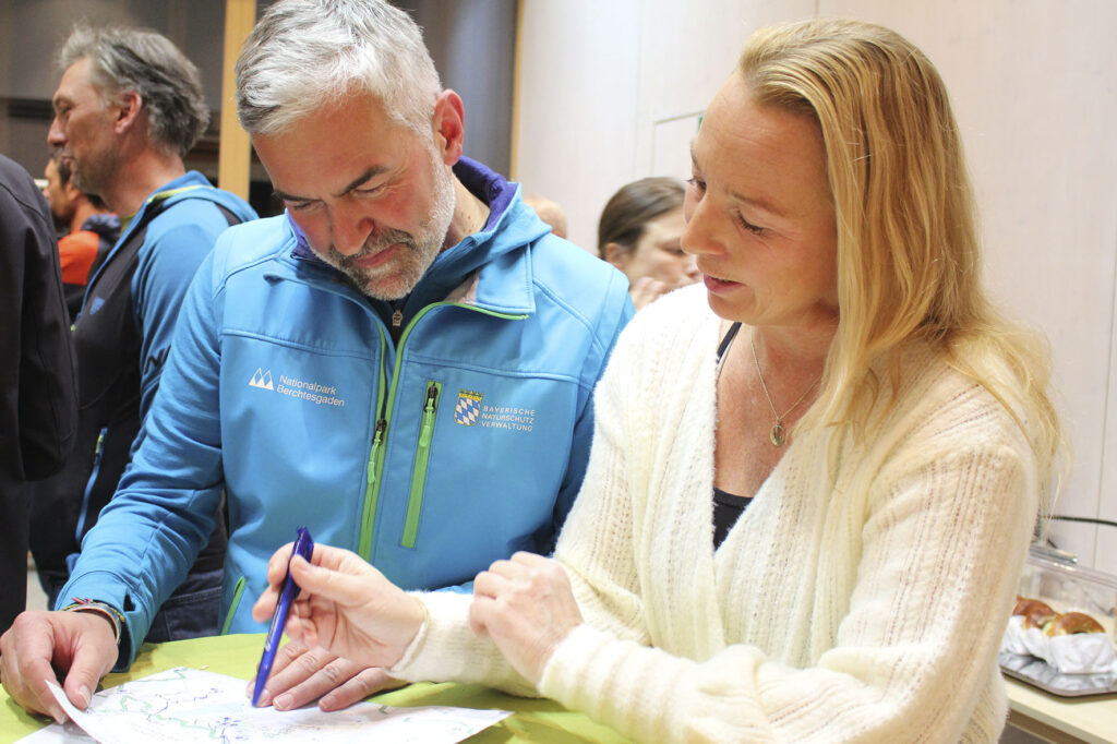Nationalparkleiter Dr. Roland Baier diskutierte am Rande der traditionellen Herbstversammlung mit der Vorsitzenden der DAV-Sektion Berchtesgaden, Gabi Schieder-Moderegger, die Gestaltung der neuen Radkarte der Nationalparkverwaltung.