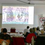 Weißenfels ging detailliert auf die beeindruckenden frühchristlichen Mosaiken in den historischen Gebäuden ein. Anhand von rund 80 Fotos erläuterte er die Darstellungen und stellte den Bezug zu den biblischen Aussagen her. Er begann seinen fiktiven Rundgang mit den ältesten noch erhaltenen Gewölbemosaiken im Mausoleum der Galla Placidia. „Die ganz wesentlich von Blautönen und Gold beherrschten Mosaiken schaffen mit der düsteren Beleuchtung eine einzigartige Stimmung,“ wie Weißenfels ausführte. Der neutestamentliche Zyklus mit den insgesamt 26 Bildfeldern über die Wundertaten und die Passion Christi in der ehemaligen arianischen Hofkirche Theoderichs, der heutigen Kirche Sant’ Apollinare Nuovo, sei, so Weißenfels, ein Höhepunkt in der Qualität des frühchristlichen Westens. „Die Verklärung in Sant‘ Apollinare in Classe zählt zu den eindrucksvollsten und wegen ihrer symbolischen Verschlüsselung zu den besonderen Bildschöpfungen der frühchristlichen Zeit.“