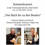 Ein Sommerkonzert unter dem Motto “Von Bach bis zu den Beatles” veranstaltet die Evangelisch-Lutherische Kirchengemeinde Bad Endorf am nächsten Sonntag, den 14. Juli 2019, ab 18 Uhr in der Dreieinigkeitskirche. Die Priener Musiker Götz von der Bey und Herbert Hägele spielen am Cello beziehungsweise an der Geige virtuose Stücke aus Barack, Klassik, Romantik, Klezmer, Tango und Pop. Der Eintritt ist frei, Spenden werden erbeten.