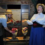 Auch auf dem von Barbara Bichler gemalten Bühnenbild für den ersten Akt dominiert der Alte Peter den Hintergrund. Er blickt auf den Verkaufsstand von Walburga Graf, einer ziemlich resoluten, von Annemarie Ramoser verkörperten, Blumenhändlerin, die nichts über ihre Rosa Centifolia kommen lässt und pikierten Damen, die es wagen, ihre edlen Blumen als “Bauernrosen” zu verunglimpfen schlagkräftig zeigt, wo der Bartel den Most holt.