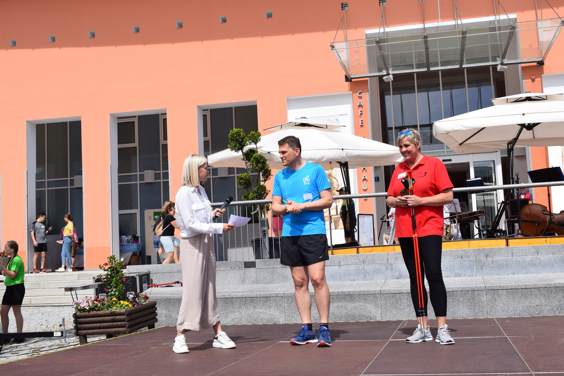 Kurz vor dem Start zum Bad Gögginger Benefiz-Lauf 2022: Moderatorin Evi Reiter (l.), Neustadts Erster Bürgermeister Thomas Memmel (m.) und Tourismus-Managerin Astrid Rundler (r.) begrüßen die Teilnehmer. Foto: TI Bad Gögging | Zitzelsberger