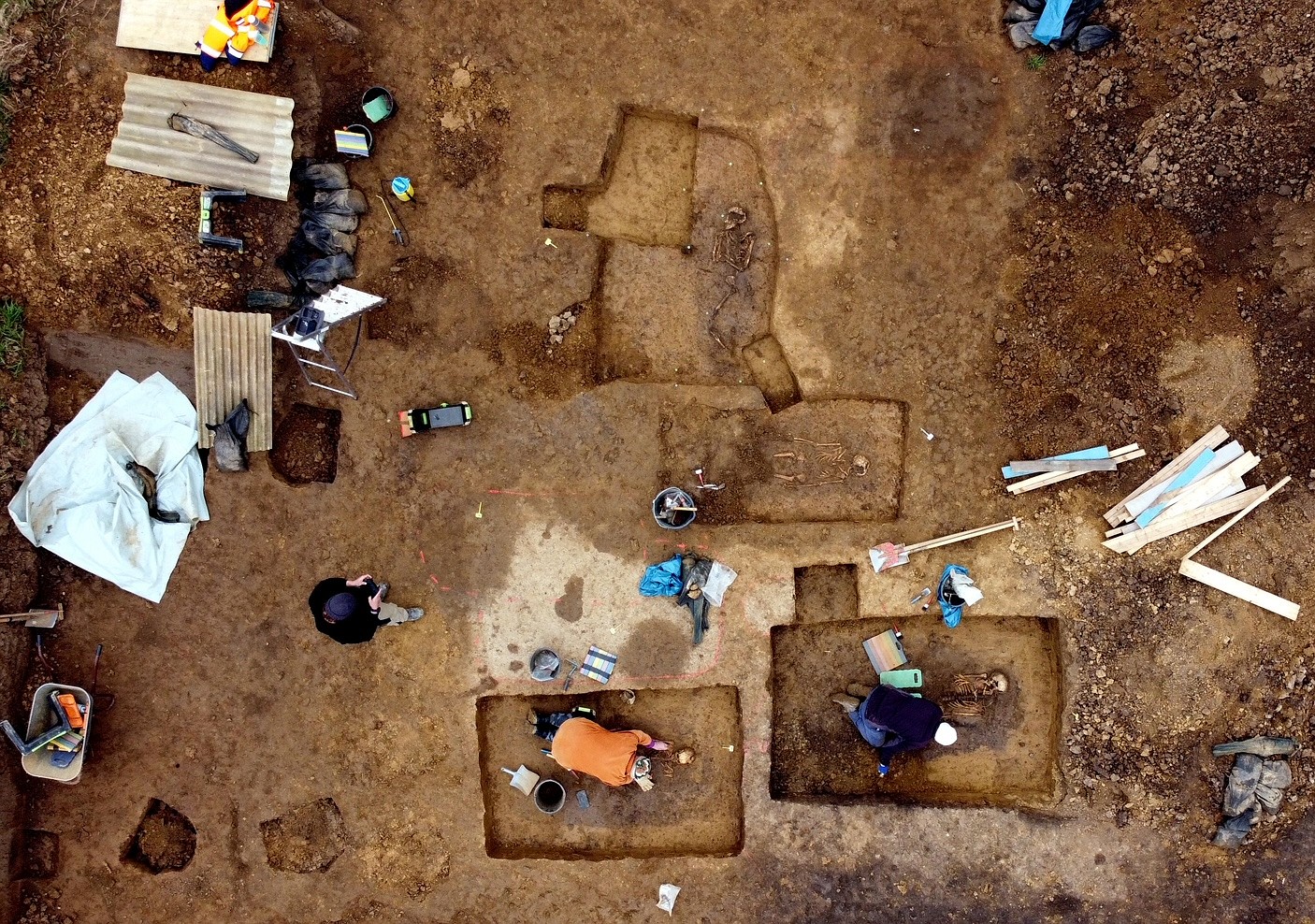 Die Ausgrabung zweier Bestattungen aus der Vogelperspektive (Foto: Landrat-samt Landshut, Kreisarchäologie, Th. Richter).
