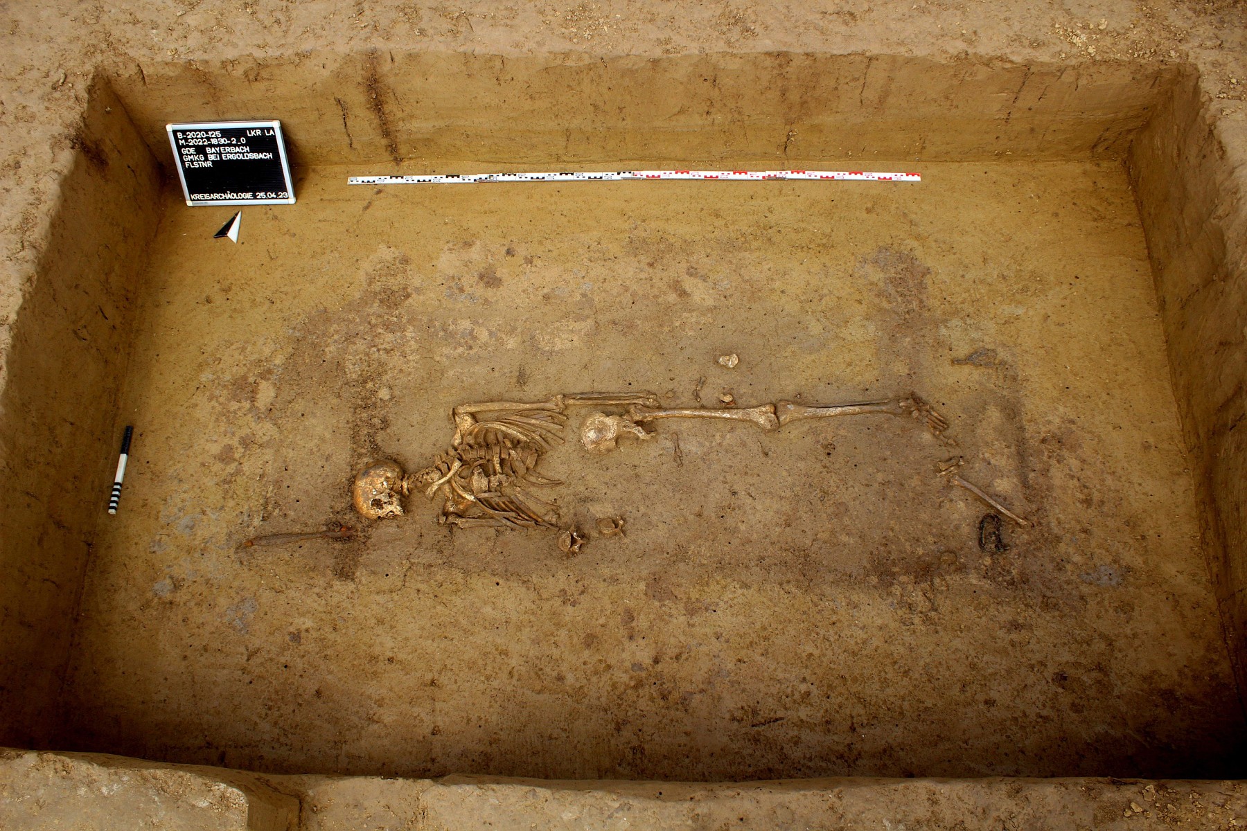 Das Grab des Fürsten von Bayerbach während der Ausgrabung. Die rechte Körperhälfte ist durch die antike Beraubung teilweise gestört (Foto: Landrats-amt Landshut, Kreisarchäologie, S. Kunz).