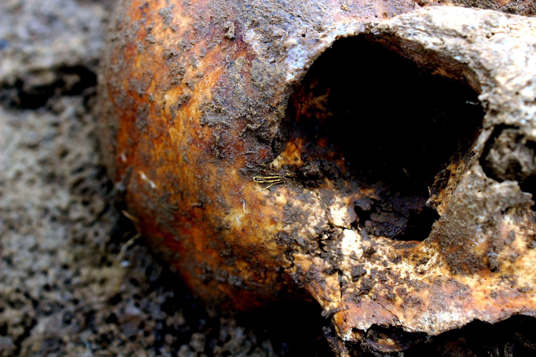 Einer der Goldfäden des golddurchwirkten Stirnbandes am Schädel des Fürs-ten (Foto: Landratsamt Landshut, Kreisarchäologie, S. Kunz).