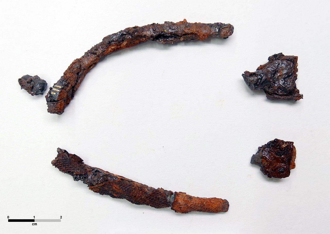 Einer der eisernen Sporen mit teilweise freigelegter Messingtauschierung und Resten der anhaftenden Kleidung des Fürsten (Foto: Bayerisches Landesamt für Denkmalpflege, Referat B V, B. Herbold).