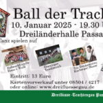 Am Freitag, 10. Januar 2025 ist es wieder so weit. Mit dem „Ball der Tracht“ des Dreiflüsse-Trachtengaues Passau wird die Ballsaison in Passau eröffnet. Zum dritten Mal laden die Trachtler zum „Ball der Tracht“ alle Tanzbegeisterten in die Dreiländerhalle ein. Eintrittskarten können im Vorverkauf bestellt werden, wie Gauvorstand Walter Söldner informiert. Aber auch in der Abendkasse sind Eintrittskarten für die Kurzentschlossenen zu bekommen.