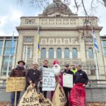 Bericht und Foto: LVÖ –  Am 6. Dezember überreichte der Nikolaus symbolisch an der Staatskanzlei Säcke mit der Aufschrift „Humus“ für Markus Söder.  Auf dem Bild: Jan Niggeman, von der Streichung betroffener Landwirt in Unterhaching; Josef Bauer, Vorstand LVÖ Bayern; Thomas Lang, Vorstand LVÖ Bayern; der Nikolaus; Josef Schmid, Arbeitsgemeinschaft bäuerliche Landwirtschaft (AbL); Martin Geilhufe, Landesbeauftragter Bund Naturschutz (BN); Hans Leis, Bund Deutscher Milchviehhalter (BDM)