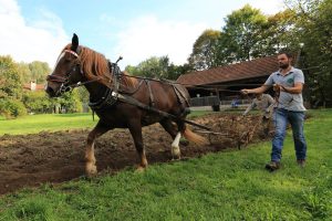 Von wegen Traktor! Mit Zug- und Spanndiensten leisteten Rösser einen Großteil der landwirtschaftlichen Arbeiten. Kaltblutpferde zeigen zum Apfel- und Erntetag wie früher das Feld umgebrochen wurde. © Bezirk Oberbayern, Archiv BHM, Fotografie Gerhard Nixdorf.