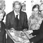 Max Raffler mit seinen Schwestern Fanny, Maria und dem damaligen Pfarrer Wolfgang Schmid in einer Ausstellung im Greifenberger Pfarrsaal, 1982