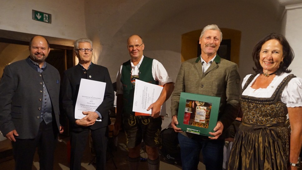 Kreisbäuerin Katharina Kern (re.) und Kreisobmann Josef Andres (li.) verabschiedeten den vorherigen Kreisobmann Josef Bodmaier (2. v. re.), den ehemaligen Vorsitzenden der Arbeitsgemeinschaft Einkommenskombination und Nebenerwerb Jakob Wallner (Mi.) und Georg Soyer (2. v. li.) nach 40 Jahren im Amt als Ortsobmann von Westerndorf St. Peter.