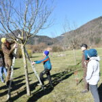 Die erste Frage „Warum müssen Obstbäume beschnitten werden?“ konnten die Besucher fast noch selbst beantworten, mit „stabiles Gerüst damit die Äste nicht abbrechen“ oder „lockere Krone, damit viel Licht und Luft ankommt“. Das trifft zum Beispiel zu bei der Empfehlung von Johanna Hörfarter, der Pyramidenkrone, auch „Oeschbergkrone“ genannt. Es ging dann sogleich ans Werk bei einem Apfelbaum, der gelichtet werden musste. Johanna Hörfarter hatte auch noch drei von ihren Schülern dabei, die Brüder Stefan und Sebastian aus Unterwössen und Martin aus Reit im Winkl. Auf die Frage was die jungen Buben von zehn und zwölf Jahren motivierte an ihrem freien Tag frühmorgens zu so einem Kurs zu kommen, war die klare Antwort, wir wollen wissen wie es geht und zuhause mit unseren Bäumen alles richtig machen. Martin kletterte dann auch gleich auf die Leiter und in den Apfelbaum und entfernte mit der Säge, nach den Kommandos von unten, die störenden Äste. Alle Beteiligten machten sich Gedanken, wie am sinnvollsten die Pyramidenkrone entstehen kann. Zum Schluss waren alle mit ihrem Werk zufrieden und konnten sich mit einer Brotzeit stärken. wun