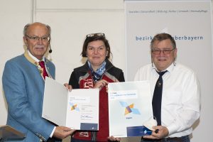 Den dritten Preis erhielt die Gemeinde Soyen. von links: Bezirkstagspräsident Josef Mederer, Afra Zantner, Zweite Bürgermeisterin der Gemeinde Soyen und Imkereifachberater Arno Bruder