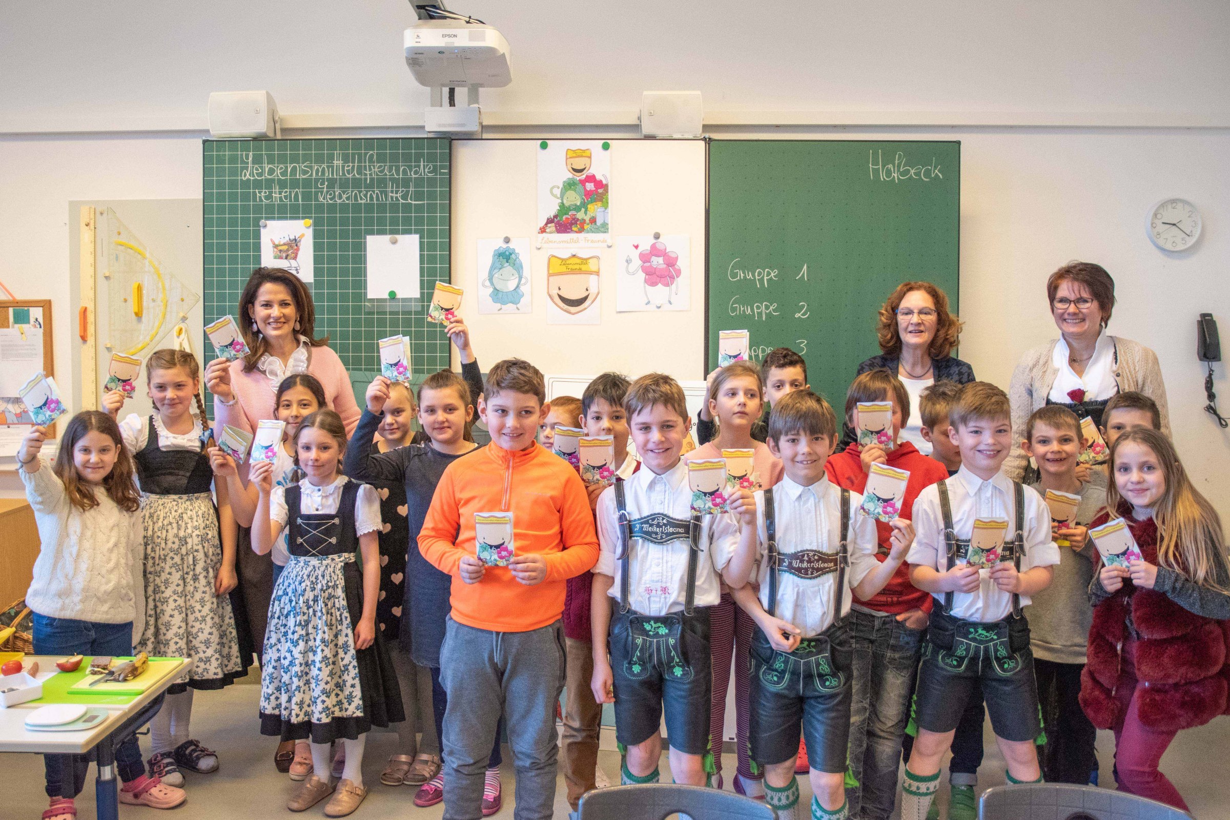 Ministerin mit Kindern der Grundschulklasse 3a in Bad Reichenhall bei der Vorstellung der „Lebensmittelfreunde“.