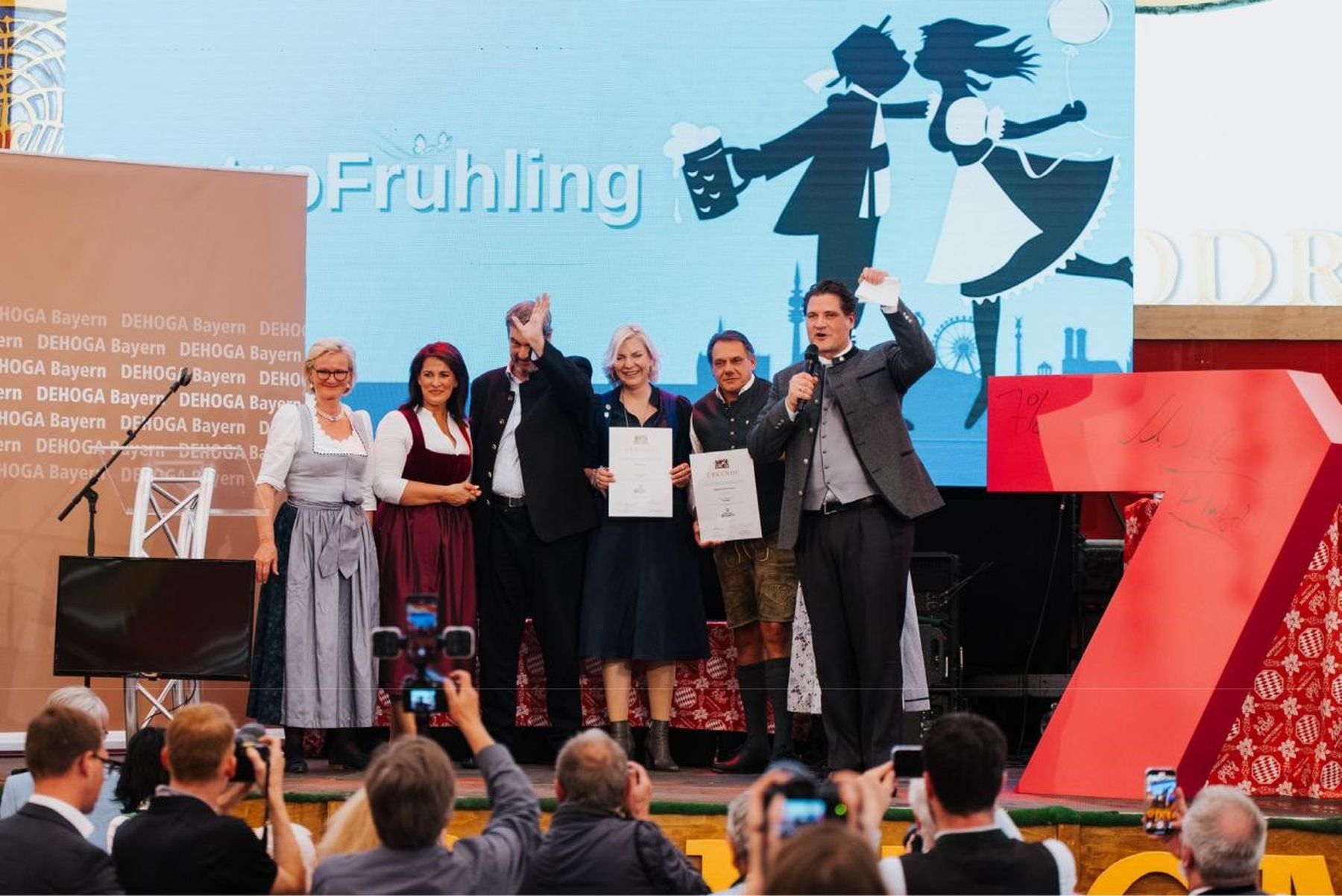 Auszeichnung der Festhalle Bayernland und des Hippodroms mit dem Qualitätssiegel „Ausgezeichnete Festhalle“ (v.l): DEHOGA Bayern-Präsidentin Angela Inselkammer, Bayerische Staatsministerin für Ernährung, Landwirtschaft, Forsten und Tourismus Michaela Kaniber, Bayerischer Ministerpräsident Dr. Markus Söder, Tina Krätz, Hippodrom, Peter Schöniger, Festhalle Bayernland und DEHOGA Bayern-Landesgeschäftsführer Dr. Thomas Geppert. Foto: Hendrik Steffens
