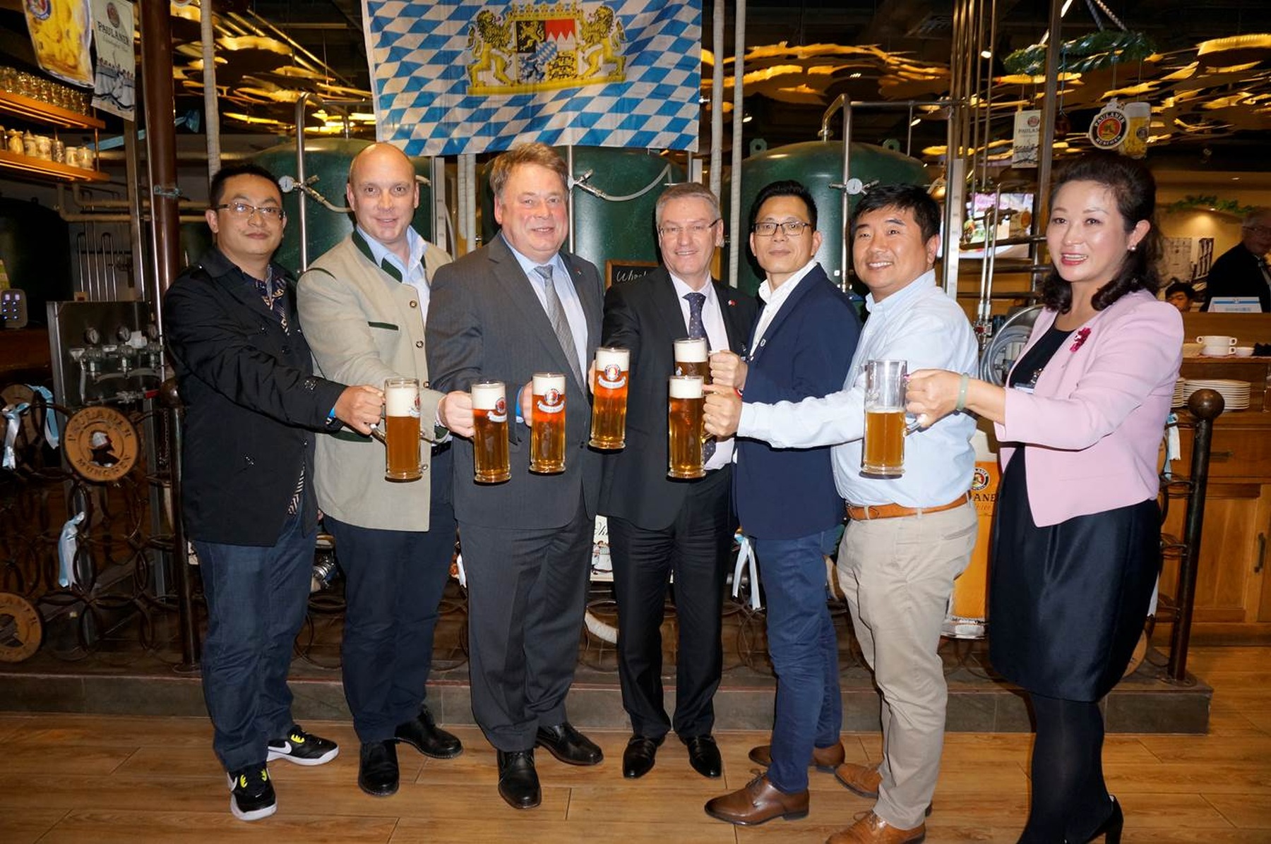 Minister Helmut Brunner mit Mitgliedern der bayerischen Wirtschaftsdelegation, dem Brauer Luitpold Egerer (2.v.l.) von der Privatbrauerei H. Egerer aus Großköllnbach (Lkr. Dingolfing-Landau) und dem Vorstandsvorsitzenden der Genossenschaftsmolkerei BMI aus Landshut, Peter Hartmann (4.v.l.), sowie chinesischen Importeuren. Ziel des “Bayerischen Abends” war es, die Importeure auf den Geschmack bayerischer Spezialitäten zu bringen.