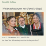 Der Tourismusverein Bayrischzell lädt am 1. Weihnachtsfeiertag, dem 25.Dezember 2023 zum Weihnachtssingen mit Familie Röpfl ein.  Die aus Rundfunk und Fernsehen bekannte Musikanten- und Sängerfamilie gestaltet um 20 Uhr im großen Saal des Klosterhofs zur Post in Bayrischzell ein vielseitiges, traditionelles Volksmusik-Konzert.