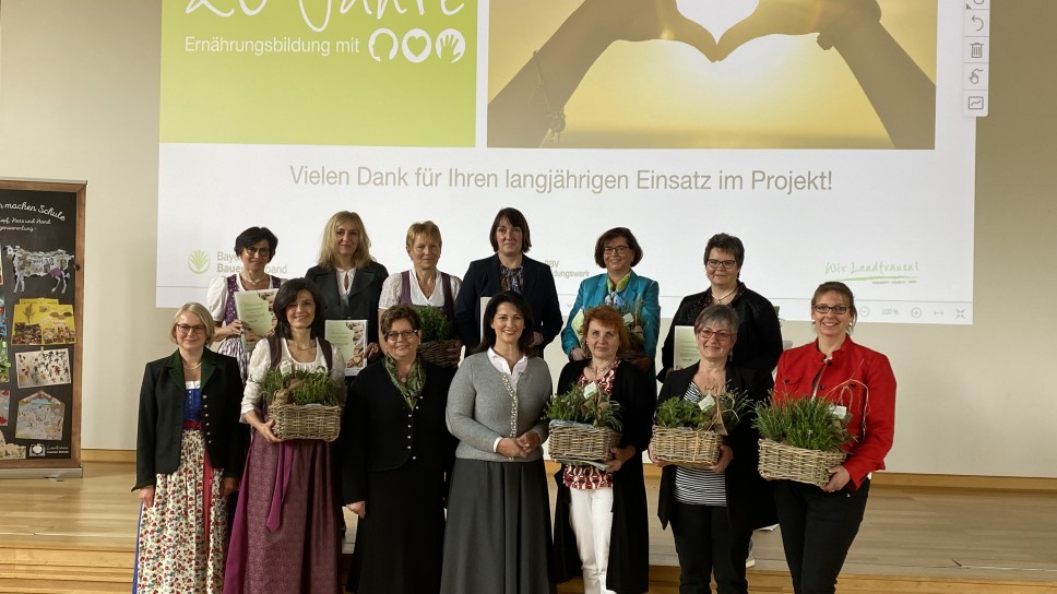 Auszeichnung und Dank an die Ernährungsfachfrauen für die langjährige Unterstützung des Projekts “Landfrauen machen Schule”: 1. Reihe (v.l.): Projektleiterin Dr. Brigitte Klamt, Jutta Löbert (Kreisverband Ebersberg), Landesbäuerin Anneliese Göller, Staatsministerin Michaela Kaniber, Jutta Weiß (Kreisverband Ansbach) , Andrea Mayr (Kreisverband Augsburg), Karina Stadelmann (Kreisverband Neustadt-Uffenheim) 2. Reihe (v.l.): Johanna Heigl (Kreisverband München), Barbara Wallner (Kreisverband Dachau), Irmgard Inninger (Kreisverband Rosenheim), Gerda Maußner (Kreisverband Nürnberger Land), Monika Haderer (Kreisverband Eggenfelden), Doris Greul-Leuzmann (Kreisverband Nürnberg-Stadt).