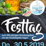 Vom 29. Mai bis zum 3. Juni feiert der Burschenverein “D’ Goldbachler” Vagen sein 100-jähriges Jubiläum mit einem Festzelt. Den Startpunkt der Festtage setzt der Bieranstich mit verbundenen Spanferkelessen am kommenden Mittwoch, den 29. Mai 2019. Der Höhepunkt, die Feier des 100-jährigen Gründungsfest, findet am darauffolgenden Christi-Himmelfahrts-Donnerstag statt. Beginn ist um 8 Uhr, die Musikkapelle Vagen spielt zur Unterhaltung auf.