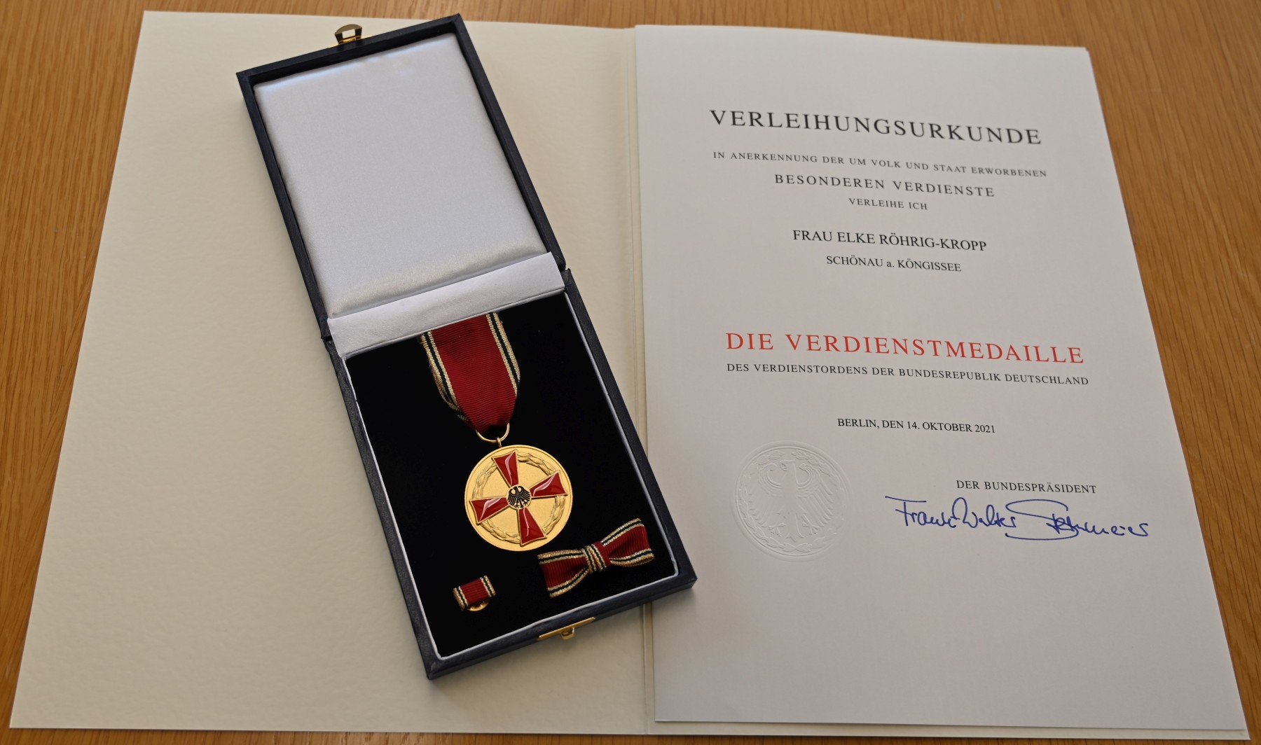 Die Verleihungsurkunde mit Verdienstmedaille des Verdienstordens der Bundesrepublik Deutschland