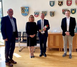 Eine Schultüte zum Abschied: Landrat Bernhard Kern (links) verabschiedete Schulamtsdirektor Klaus Biersack (2. von rechts) im Beisein von Ehefrau Gabriele Biersack und Arthur Steinbach, Leiter Personalmanagement im Landratsamt, in den Ruhestand.