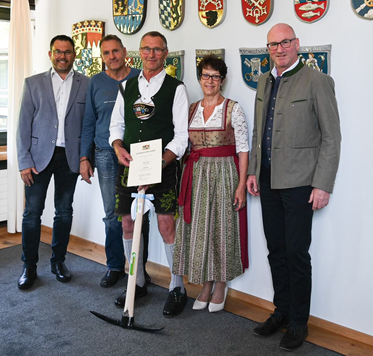 v. l.: Ersten Bürgermeister Martin Öttl (Ainring), Richard Kometer (Vermessungsamt), Franz Eder und seine Ehefrau sowie Landrat Bernhard Kern Foto: LRA BGL