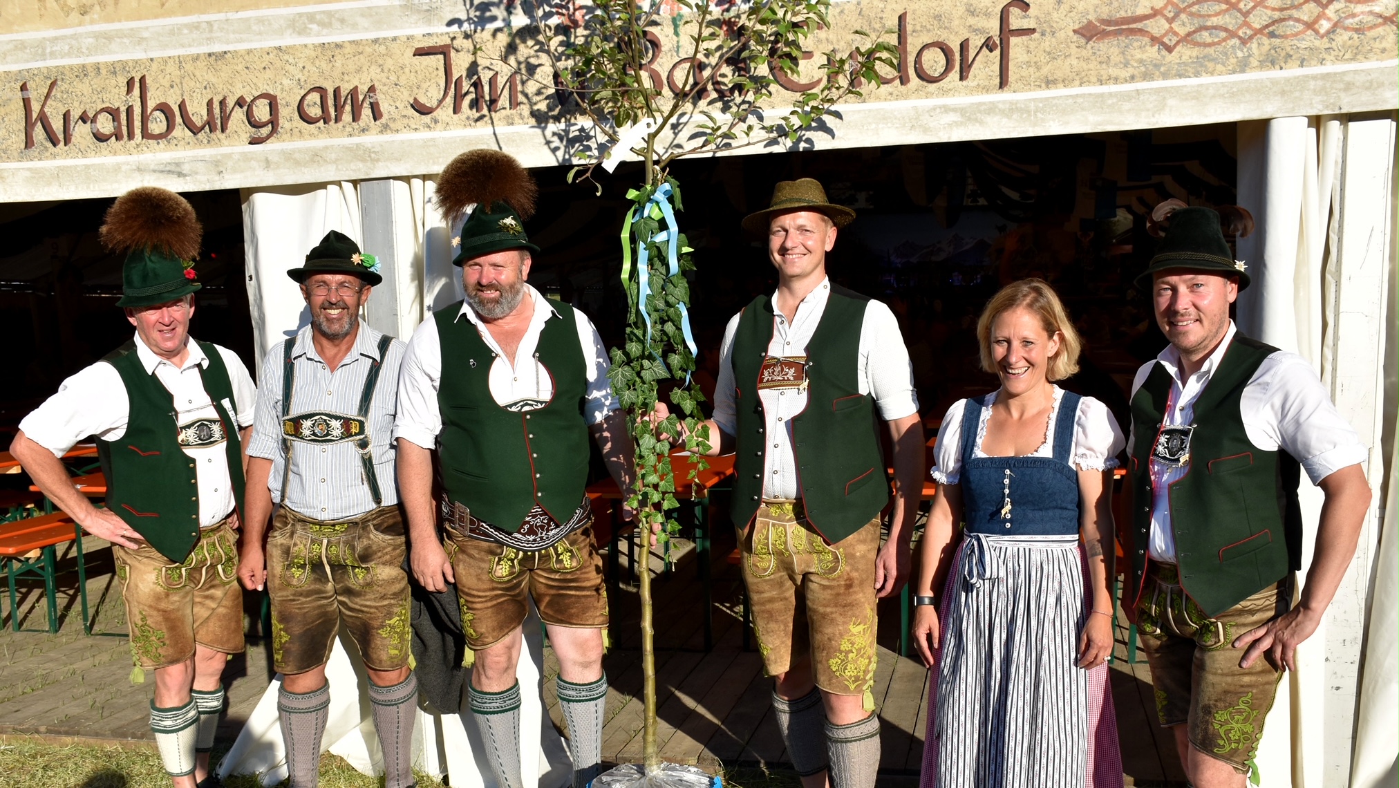 der Apfelbaum wird auf der Bühne übergeben Von links Bürgermeister aus Aschau Simon Frank, Andi Hell Vorstand d’Gamsgebirgler, Bürgermeister Schleching Josef Loferer
