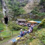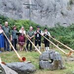 Mittags dann ein musikalisches Ständchen vor der Erntekranzbaude in Oppach, einem Ausflugs- und Speisegasstätte direkt an der B 96. Danach ging es weiter über die Grenze nach Tschechien, nach Jirikov. Dort wurden die Alphornbläser schon sehnlichst erwartet. Insbesondere waren die Jüngsten vom dortigen Kindergarten von den Klängen der kuriosen Instrumente aus dem Alpenraum begeistert. In dieser tschechischen Grenzregion war das alpine Konzert eine Premiere. Zum Dank luden Věra Vlčková und Oldřich Podzimek vom Betlemaru, dem Museum der Stadt, die Gäste aus Berlin zu einer Führung durch die einmalige Krippenausstellung ein. Ein Gemeinschafts-Konzert in Jonsdorf, im „Schwarzen Loch“, zusammen mit der Folkband „Fauler Lenz“ aus Mittelherwigsdorf, rundete den ersten Tournee-Tag stimmungsvoll ab. Bereits vor einem Jahr gab sich das Berliner Alphornensemble die Ehre, dort vor einer einzigartigen Gebirgs-Kulisse, ihre Alphörner erschallen zu lassen. und das in bayerischer Tracht. Mit traditionellen Kompositionen aus dem Alpenland und modernen Stücken von dem Berliner Alphornkomponisten Andreas Frey war das einstündige Konzert für die Zuschauer sicherlich ein Klangerlebnis der besonderen Art.