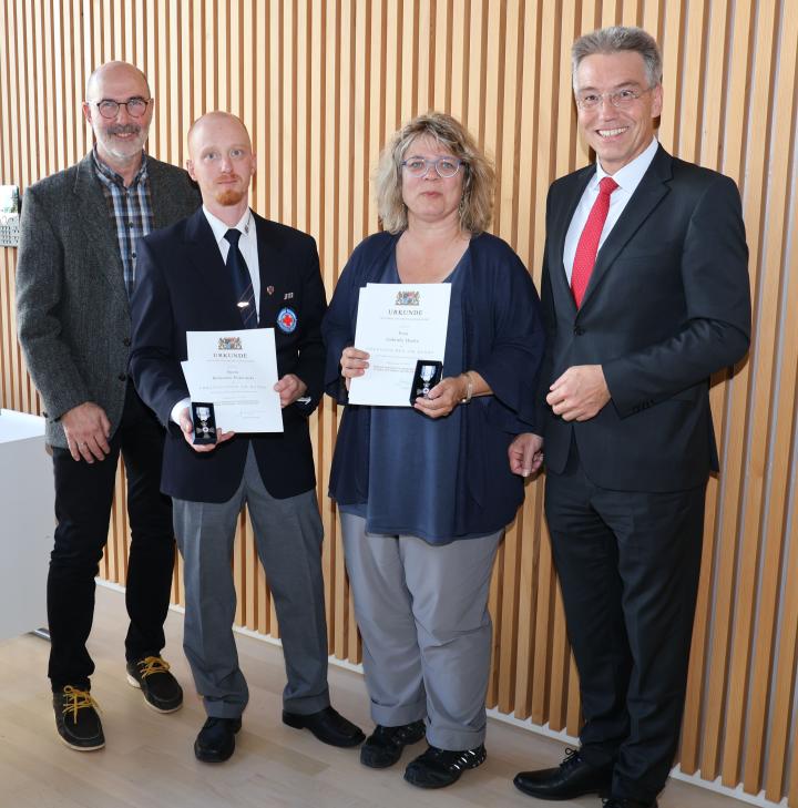 Die Bernauer Gaby Henke und Ben Pukropski bei der Ehrung für Ihr Engagement bei der Wasserwacht bzw. dem Roten Kreuz mit zweiten Bürgermeister Gerhard Jell und Landrat Otto Lederer.